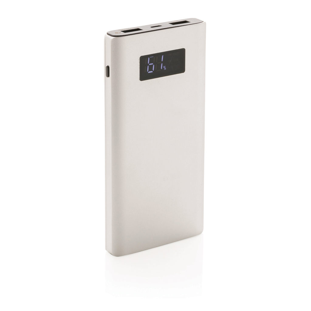 Aluminiumpowerbank med hållbart litiumpolybatteri på 10.000 mAh och LCD-skärm för visning av den kvarvarande energinivån. Har två USB-utgångsportar inklusive en snabbladdnings-3.0-port för snabb och effektiv laddning. Output: DC 5 V/3 A, 9 V/2 A, 12 V/1,5 A, input 5 V/3 A. Micro USB-kabel medföljer.