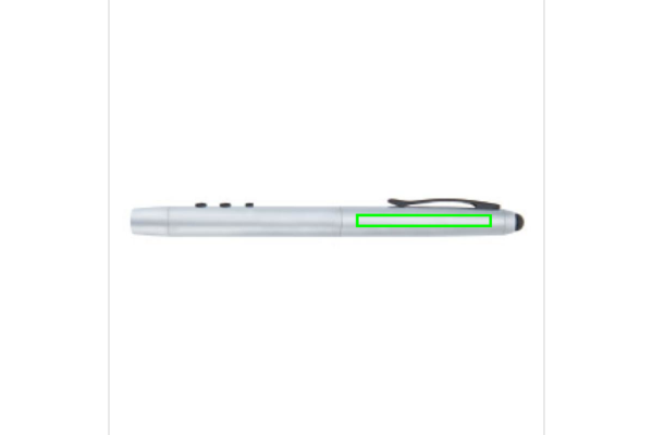 4 i 1 presentationspenna i silver, med laserpekare, penna med svart bläck och styluspenna. Utrustad med mottagare i mässing med nyckelring. Sex cellbatterier medföljer.