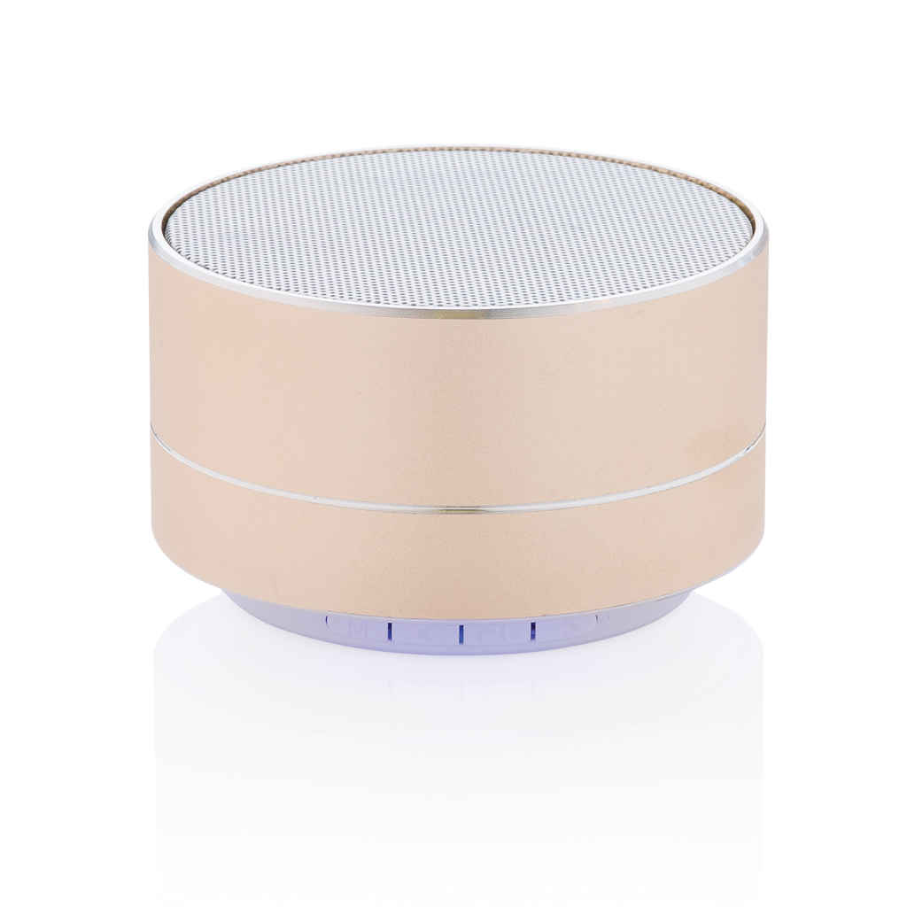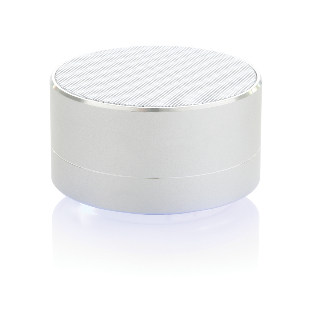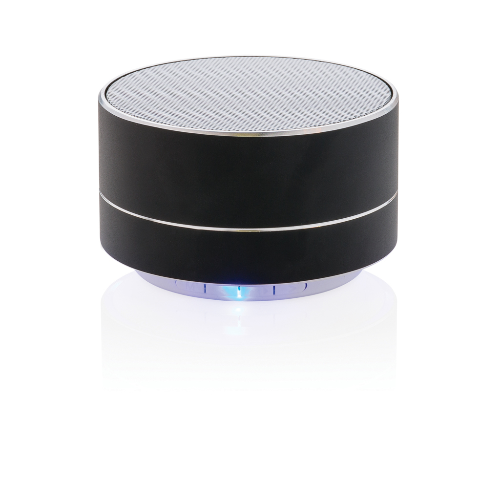 3W aluminiumhögtalare med inbyggt 300 mAh litiumbatteri. Speltid upp till 4 timmar på en enda laddning med 10 m räckvidd. Högtalaren har ett blått bottenljus vid påslaget läge. Svarfunktion för inkommande samtal.