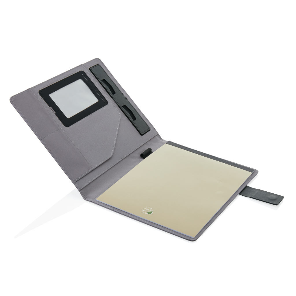 Teknikportfölj i A4-format med lyxig magnetisk stängning. Inuti finns ställ för surfplatta/smartphone, mobilhållare med genomskinligt fönster som gör det möjligt att använda enheten. Lämpar sig för de flesta telefonerna, till exempel iPhone 6 och Samsung S6. Med fack för dokument, två korthållare och en pennhållare. Ett anteckningsblock i A4-format medföljer.
