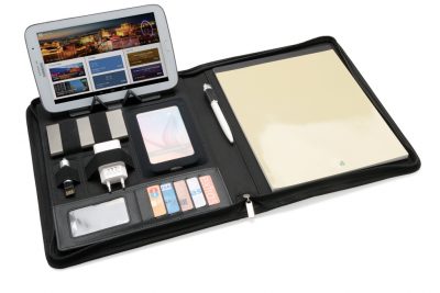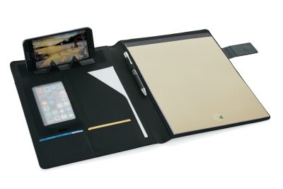 Praktisk A4 portfolio med trådlös laddning. Inkluderar även en extern powerbank. Den eleganta portfolion har ett inbyggt telefonställ med trådlös laddning, elastisk pennloop, 3 fack för visitkort samt andra fack. Anteckningsblocket har 20 sidor 80 gr/m2 krämfärgat linjerat papper. Tillverkad av en materialmix av RPET och PU. Input: 5V/2A; Output:5V/2A. Trådlös input 5V/2A, Output 5V/1A. Levereras i fullfärgstryckt presentkartong.