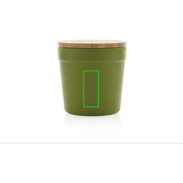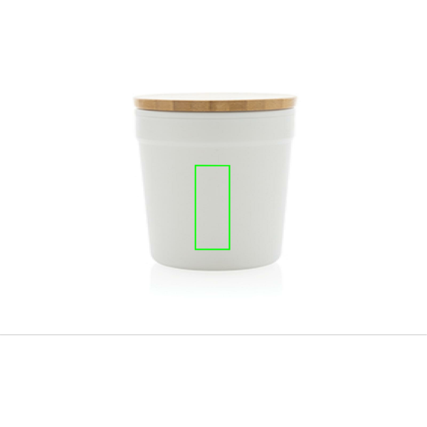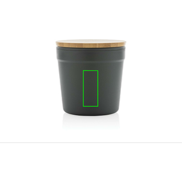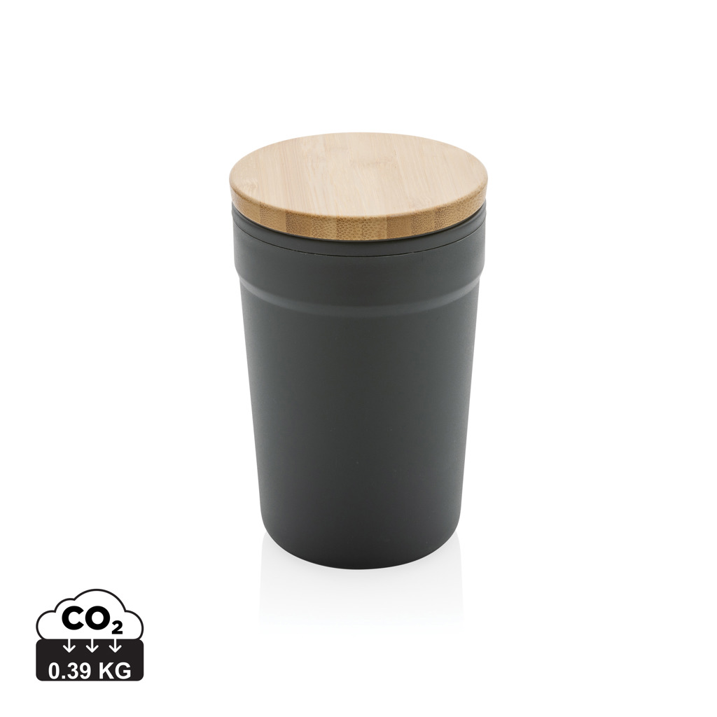 Mugg tillverkad av GRS certifierad återvunnen PP. GRS certifiering säkerställer en helt certifierad leveranskedja av de återvunna materialen. Muggen har ett lock i bambu. Totalt återvunnet innehåll: 52% baserat på total produktvikt. Själva muggen kan användas i mikro och diskas i maskin, ej locket. BPA-fri. Volym: 300ml. Levereras i FSC® certifierad kraft förpackning.