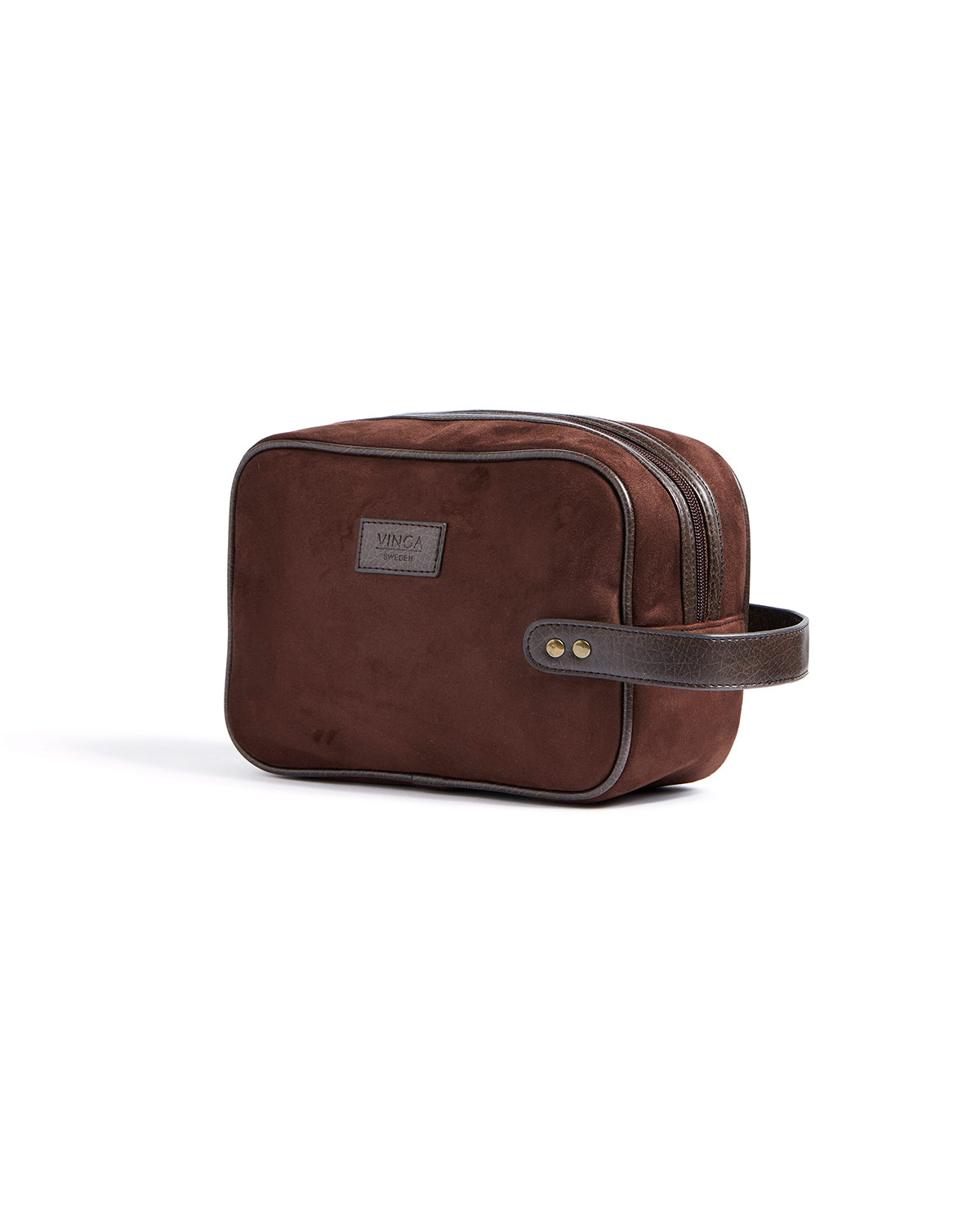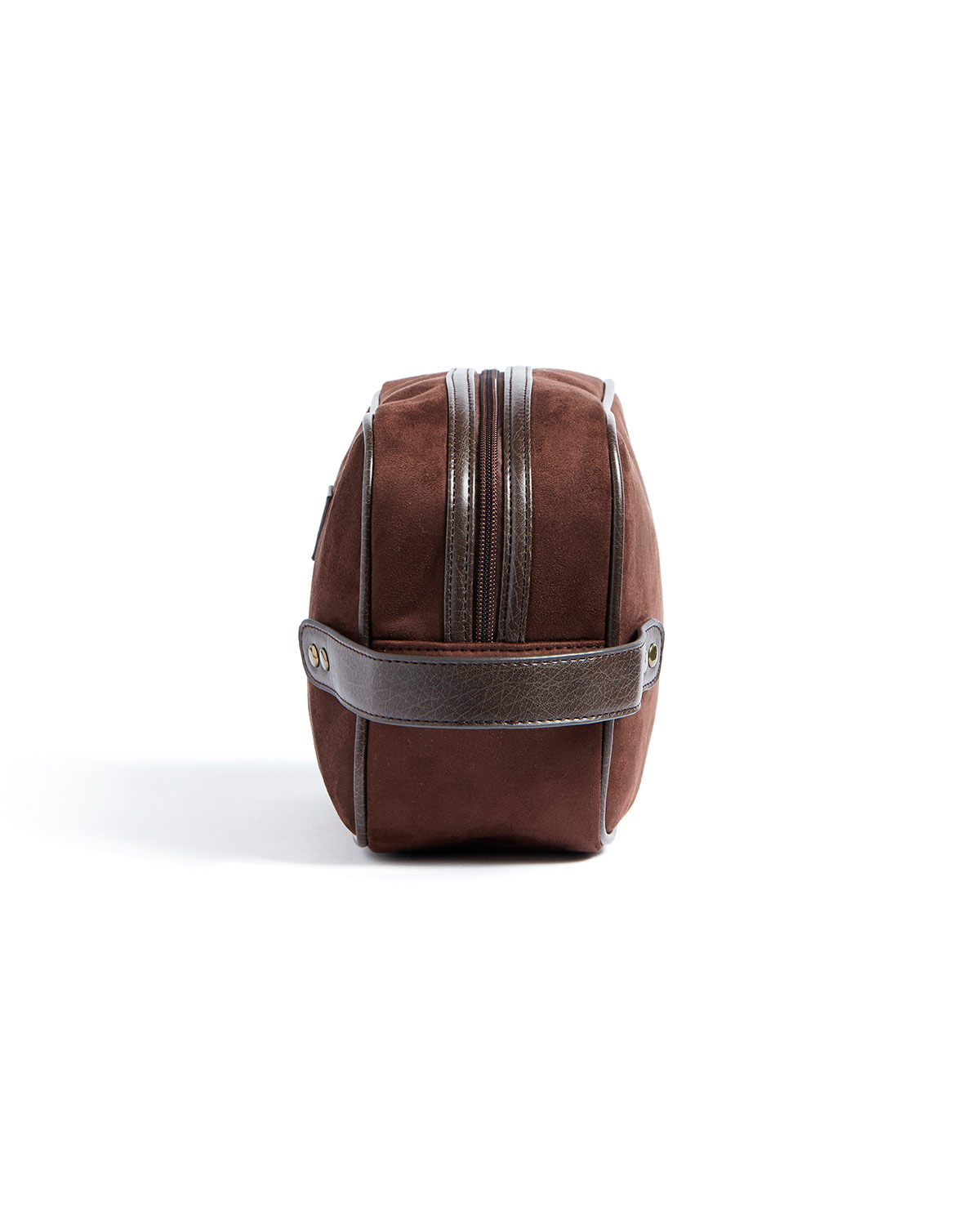 Klassisk om än modern necessär i mockaimitation med detaljer i PU-läder. Necessären gör det smidigt för dig att förvara dina hygienartiklar med stil, såväl i hemmet som på resan. Den har en behändig storlek och är lätt att bära med sig, då den försetts med en bärrem med detaljer i mässing på kortsidan.