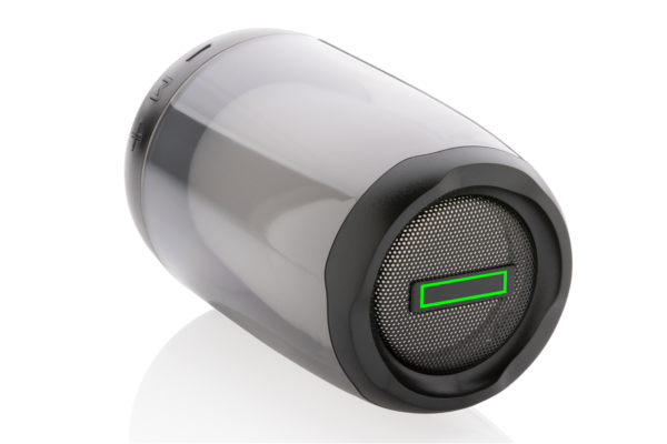 Bärbar 5W högtalare med bländande 360 grader RGB LED-ljus. Lightboom lyser starkt hela natten lång. Den unika designen gör att ljudet är lika klart i alla riktingar. Höljet är tillverkat av RCS certifierad återvunnen ABS/PS plast. Totalt återvunnet innehåll: 33% baserat på total produktvikt. Lithium-batteriet på 1200 mAH ger en speltid på upp till 5 timmar och kan laddas upp på ca 4 timmar. Med integrerad mikrofon för att besvara samtal. Integrerad TF-kortplats, AUX in-port och USB port. BT 5.0 ger en räckvidd på upp till 10 meter. PVC fri laddningskabel i återvunnen TPE medföljer. Produkt och accessoarer är 100% PVC-fria. Levereras i FSC mix förpackning.