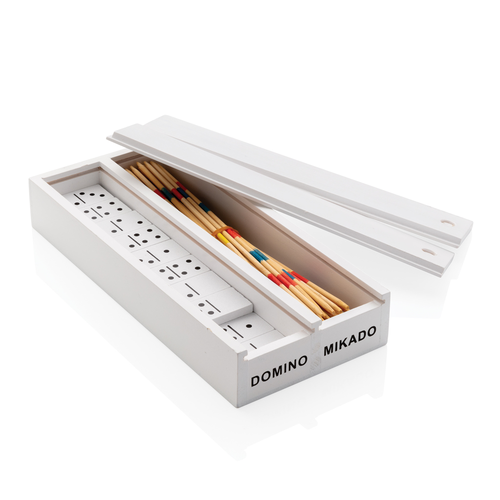 Set med två vintage-spel i en MDF-box. Setet innehåller Mikado (plockepinn) och domino. Skapa roliga tillfällen med dessa klassiska spel. Mikado (plockepinn) har 41st pinnar och Domino 28 brickor. Förvara spelen i den vita lådan med lock. Levereras i fullfärgstryckt box.