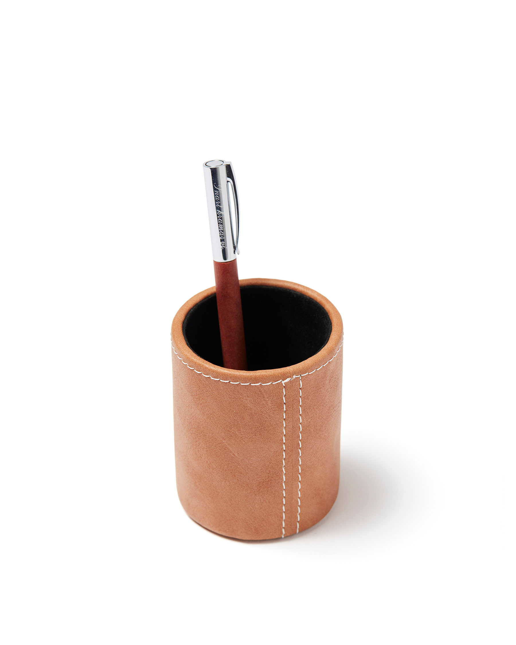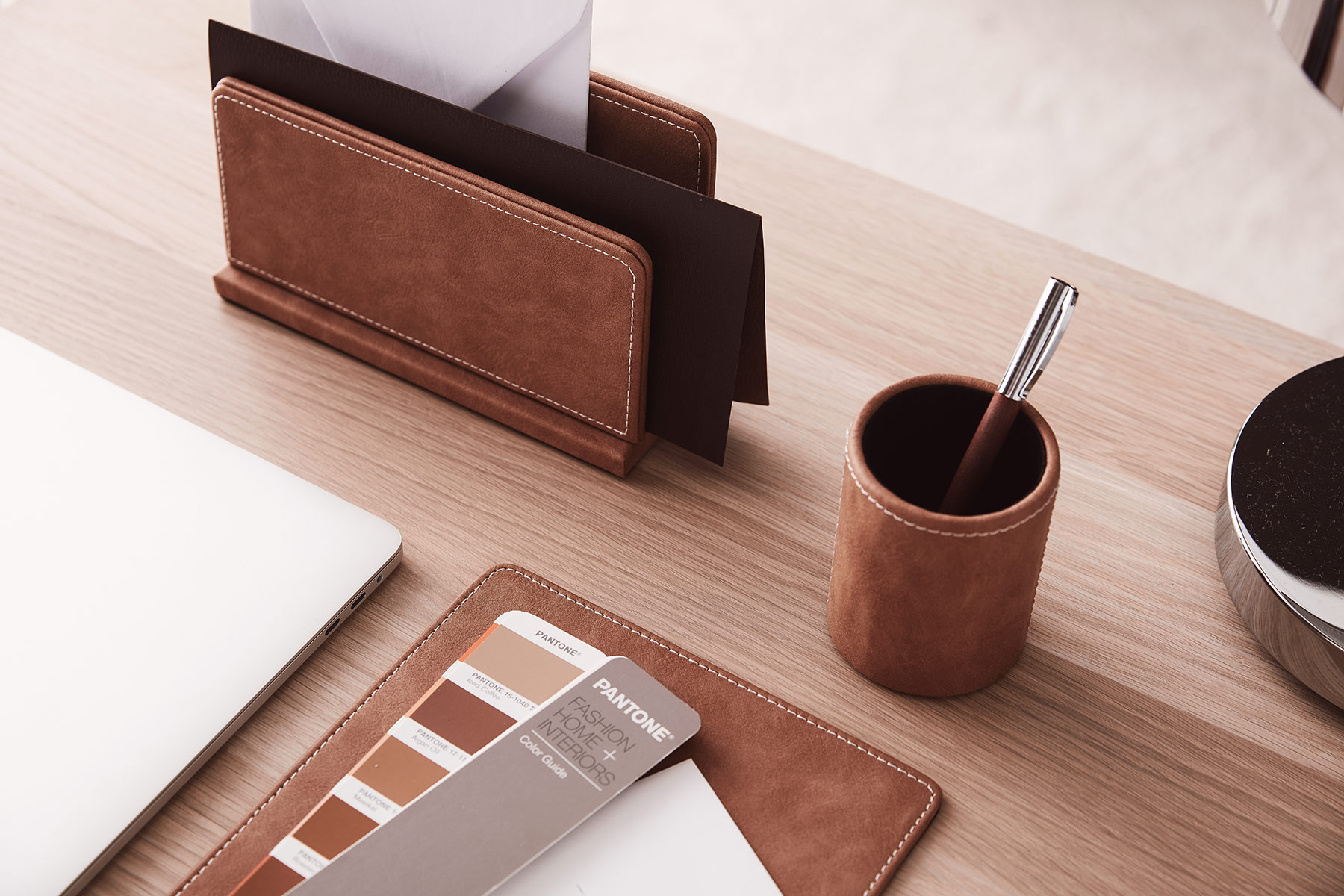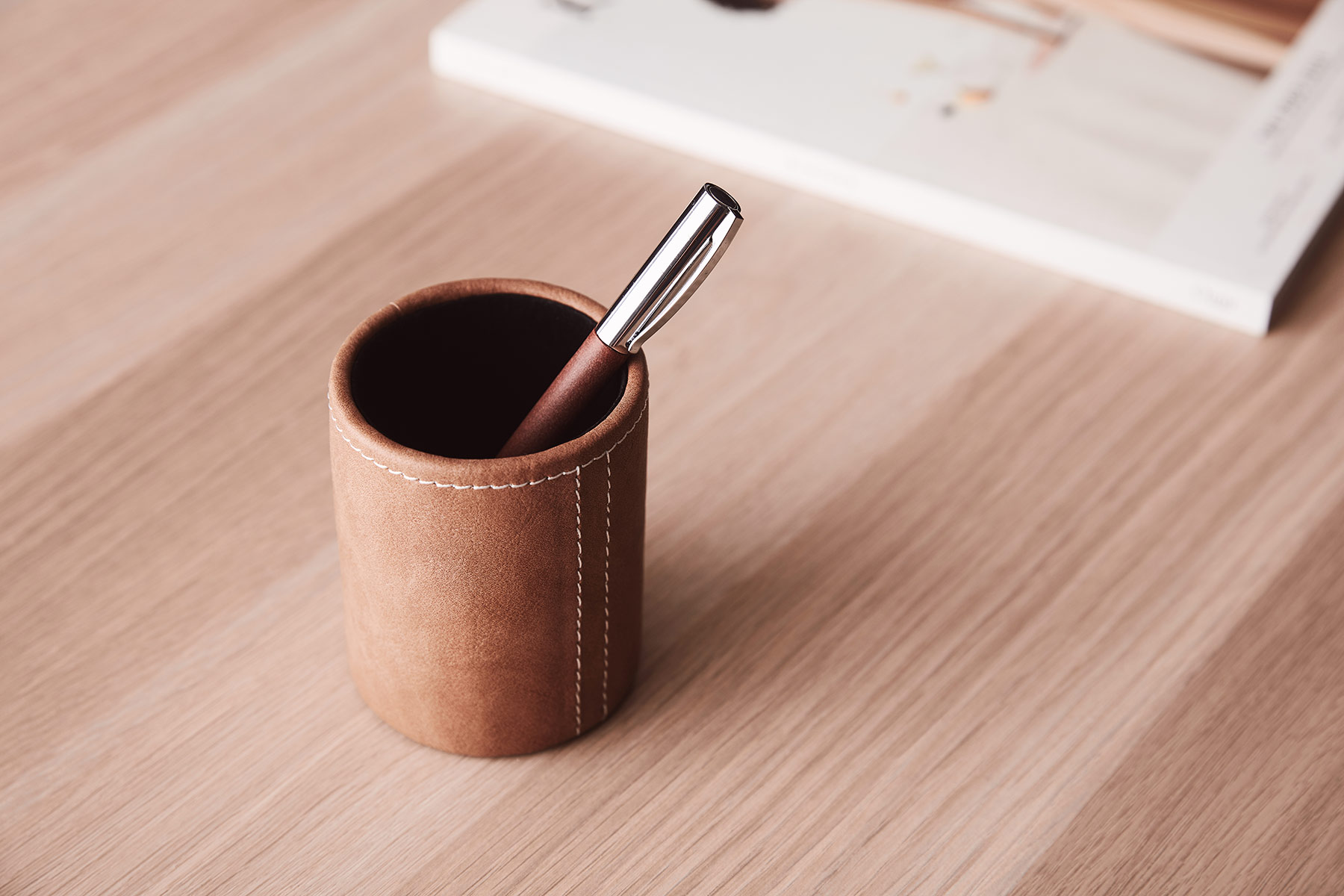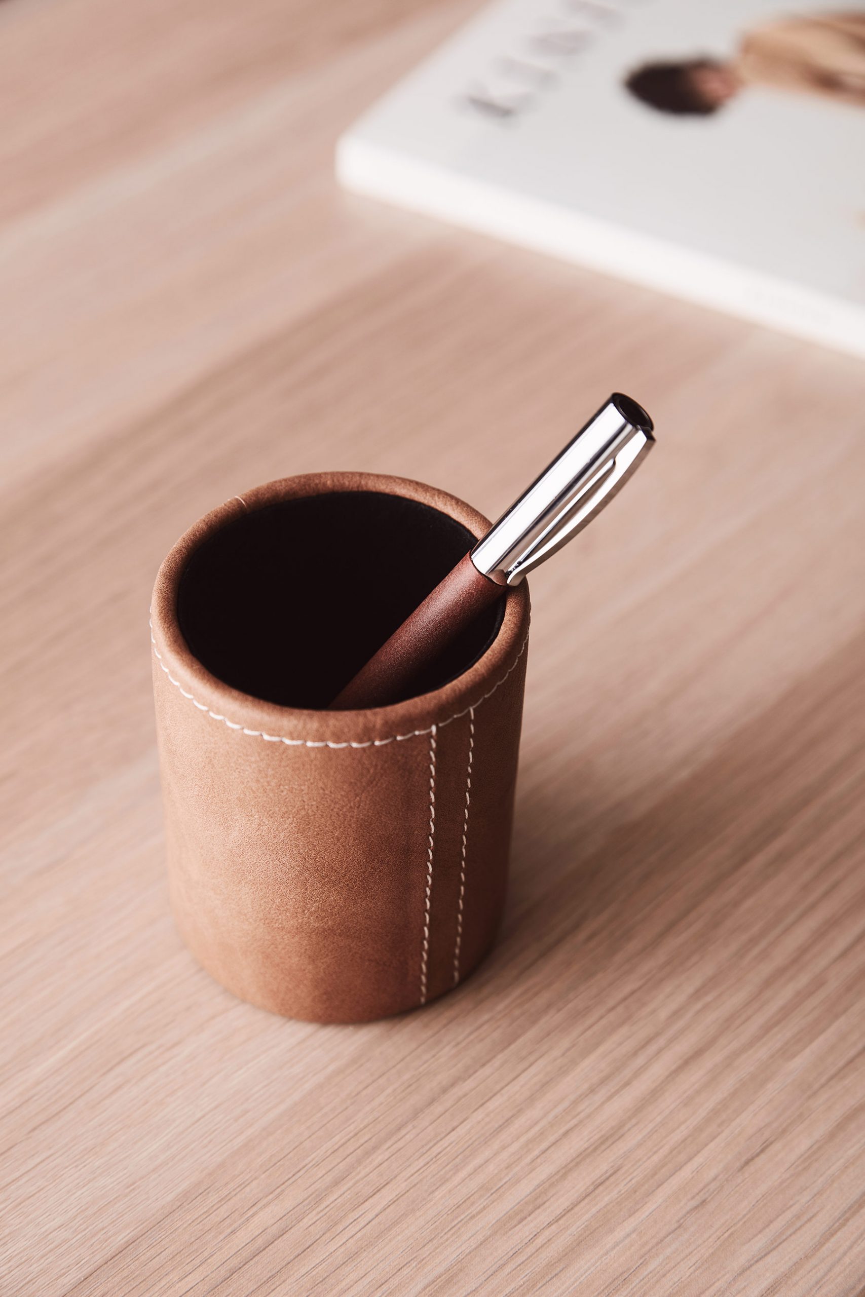 Pennburk i cognacsfärgat veganläder med vita kontrast sömmar. Inred kontoret med stil.