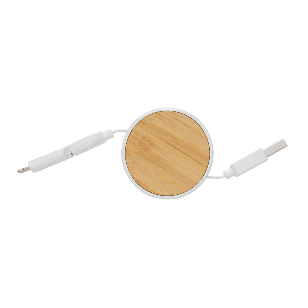 Kompakt och utdragbar ECO 3-i-1 laddningskabel med type C och dubbelsidig kontakt för IOS och Android-enheter som kräver micro USB. Tack vare att kabeln är utdragningsbar kan den 100cm långa platta kabeln enkelt tas med utan trassel. Naturlig bambu och ABS hölje med kabel i TPU. Levereras i ECO papperspåse.