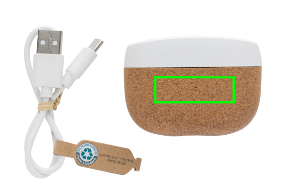 Trådlösa öronsnäckor med elegant design tillverkade av FSC® 100% kork och RCS (Recycled Claim Standard) certifierad återvunnen ABS. Totalt återvunnet innehåll: 35% baserat på total produktvikt. RCS-certifieringen garanterar en helt certifierad leveranskedja för de återvunna materialen. Öronsnäckorna har ett 35 mAh-batteri och kan laddas på nytt i 300 mAh-laddningsfodralet på 1,5 timme. Med automatisk parkoppling så det är enkelt att para ihop med din mobila enhet. Speltid på medelhög volym ca 3 timmar. Med BT 5.3 för optimal anslutning. Räckvidd upp till 10 meter. Med mikrofon för att besvara samtal. Membran i 3 storlekar samt laddningskabel av RCS-certifierad återvunnen TPE medföljer. Levereras i FSC® mix kraftförpackning. Produkten och tillbehören är 100% PVC-fria.