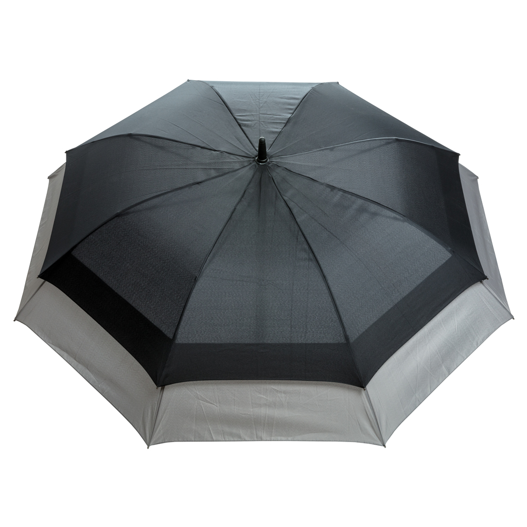 Hopvikt är paraplyet lika lätt och litet som ett 23″ paraply. När det fälls upp expanderar det automatiskt till 27″. Det erbjuder mer skydd mot regnet och plats för två personer. Paraplyet har automatisk öppning, 190T pongee polyester och metallskaft, fiberglasram, PP-topp, matt svart handtag. Med vindsäkert system.