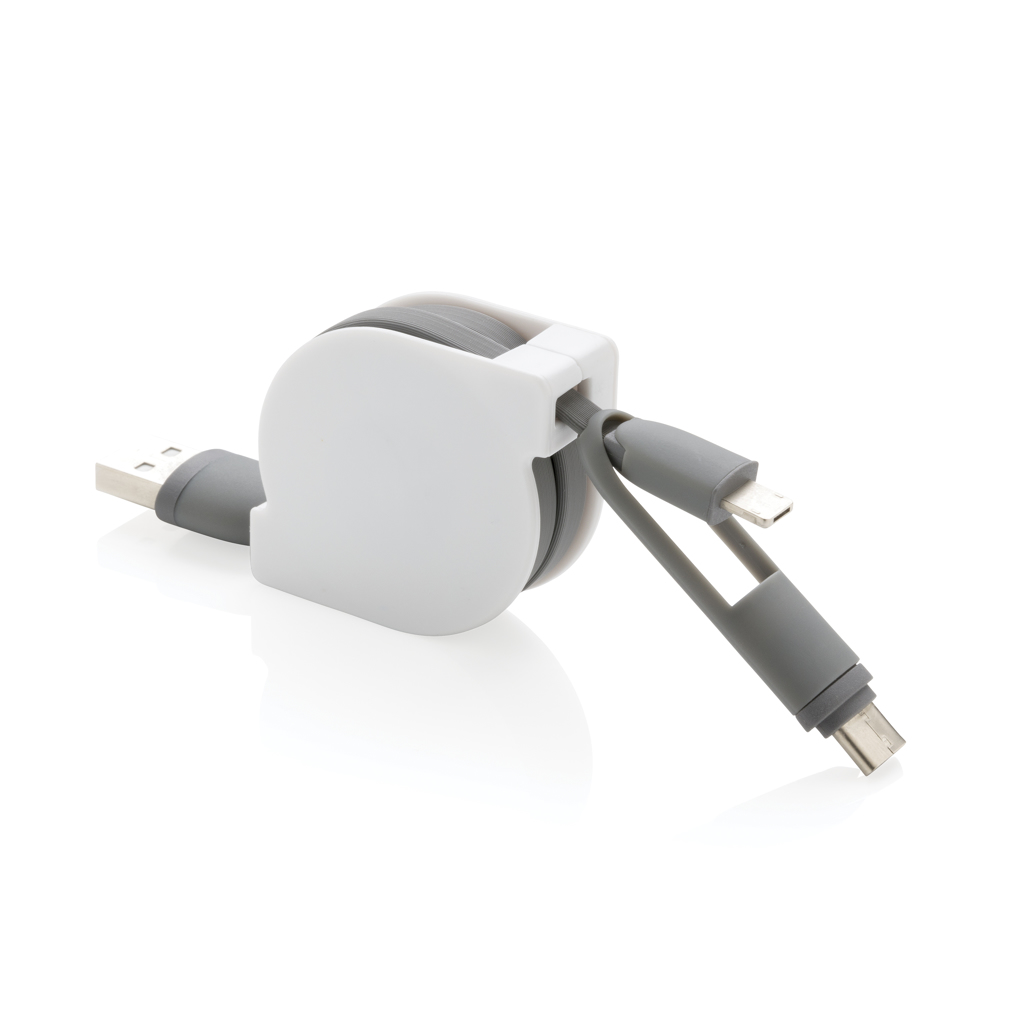 Kompakt och utdragbar 3 i 1 laddningskabel med type C och dubbelsidig kontakt för iOS och Android-enheter som kräver micro USB. Den utdragbara platta kabeln på 100cm kan lätt tas med utan att kabeln trasslar sig. Hölje i ABS, TPU-kabel. Även lämplig för synkronisering.